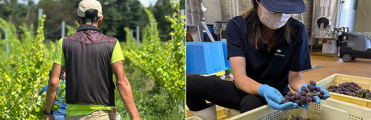 明野の土壌は通気性と通水性が良く、ブドウの根にとって理想的な排水性を提供し、根の発育を促進します。また、明野町は日照時間と日照量が日本一とも言われており、ブドウ栽培に非常に適した環境が整っています。現在、北杜明野ヴィンヤードでは2.7ヘクタールの圃場を管理しており、減農薬栽培と化学肥料の不使用に積極的に取り組んでいます。例えば、有機栽培でも使用が認められているボルドー液は、土壌中の銅の蓄積を防ぐため、一切使用せず、農薬散布料を従来の慣行栽培と比較して40〜60%削減しています。豊かな圃場には虫も多く付きますが、殺虫剤の使用を控え、木酢液などを活用して土壌やブドウの健全化に努めています。さらに、持続可能な自然との調和を大切にした栽培方法を実践しています。冬に剪定した枝を炭にして再び畑に戻すことで、大気中の二酸化炭素の排出を減らし、草生栽培を通じて土壌に炭素を貯め込む取り組みを行っています。この方法により、自然と調和した持続可能な栽培が実現されています。
