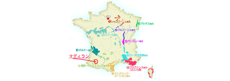 マディランは、フランス南部のスペイン国境よりにある人口500人程の小さな村です。(ミディ・ピレネー地域圏のオート・ガロンヌ県南部)この村を中心に造られているAOCワインが、赤のマディランと白のパシュラン・デュ・ヴィクビルです。ヴァン・ド・ペイのコート・ド・ガスコーニュも生産地域が重複しています。