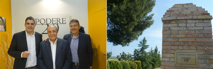 2007年に設立の、まだ新しいワイナリーです。プーリア北部、フォッジャ県チェリニョーラのボルゴ トレッサンティで、パオロ マッラーノと息子のジュゼッペによって営まれています。2011年から、大学卒業後からワイン造りに携わっていた、パオロの弟のミケーレが参加、畑仕事のために常駐しています。「プーリアは大量生産で質の低いものが多い。自分達は、デリケートで難しい葡萄品種を使い、他の人のやっていないワインを造りたい。」と語ります。収穫の1ヶ月前に畑で選別を行います。Podere 29の名前の由来は、第1次世界大戦後、退役軍人に土地の貸与が行われた際、ここが29区画目のPodere(農場)だったためです。ラベルの木は桑で、Gelsoも桑の木という意味です。祖父が別の場所に土地を持っていて、そこにあった桑の木が枯れそうでした。それを、今カンティーナのある場所に移したら元気になったので、再出発という意味も込め、カンティーナのシンボルとしました。