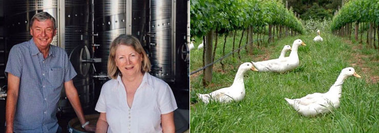 畑では化学薬品や農薬は一切使せず、ビオディナミ農法に沿って畑の手入れを行い、認可を受けた有機物と農場の草木を再利用した自家製のコンポスト(堆肥)だけを利用し、自然な農法でブドウを栽培しています。畑の畝の間の除草はとても気性のおとなしい馬、マドックスが行います。マッドクスはアヒルが畑をパトロールする(虫を食べる)間は、優しく畑を耕しながら待つのが大好きな優しい馬です。また、ブドウそのままの姿を賛美したいので、害虫の駆除は大切なチームの一員である小さな、そしてとても大切なアヒルたちに任せることにしています。アヒルたちは農場で飼われており、害虫を毎日食べるよう訓練されています。いつも午後4時になると列をなして家に帰る可愛らしい姿を見ることができます。